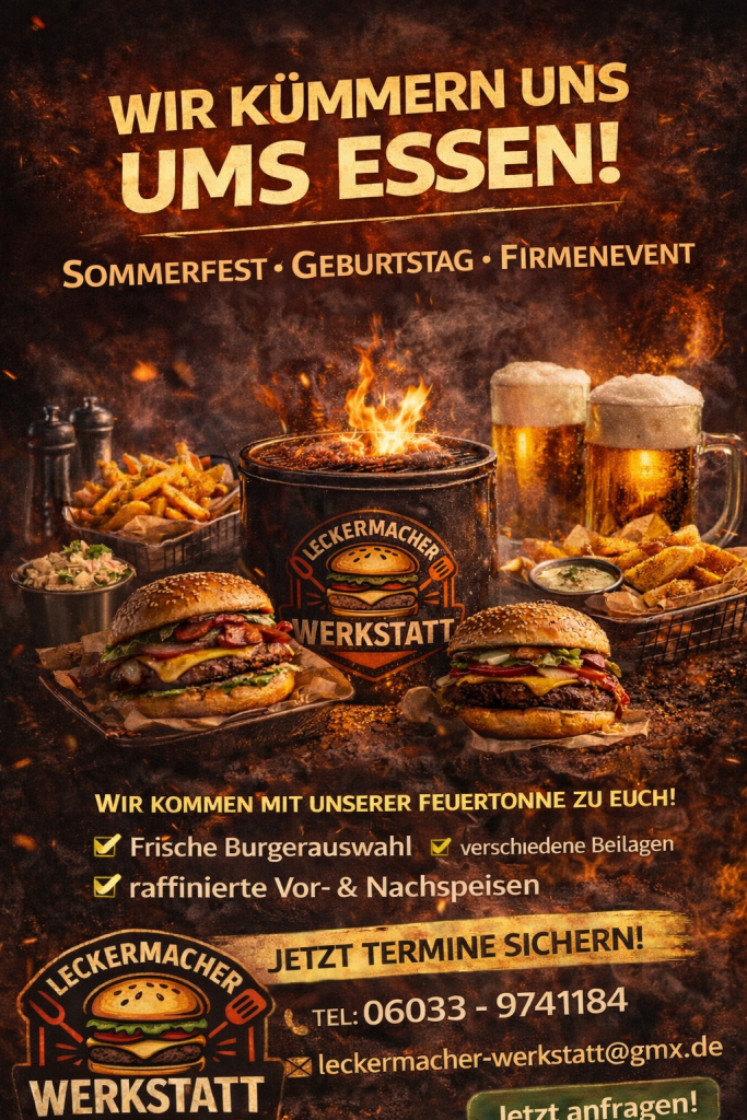 Schön, dass du da bist! Bei uns bekommst du hausgemachte Burger und Snacks zum Mitnehmen – frisch, lecker und mit Liebe gemacht. Außerdem bieten wir individuelles Catering für Events aller Art – egal ob Firmenfeier, Geburtstag oder Hochzeit. Qualität und Geschmack stehen bei uns an erster Stelle. Mit viel Leidenschaft, besten Zutaten und einem Gespür für Genuss sind wir für dich in der Region unterwegs.