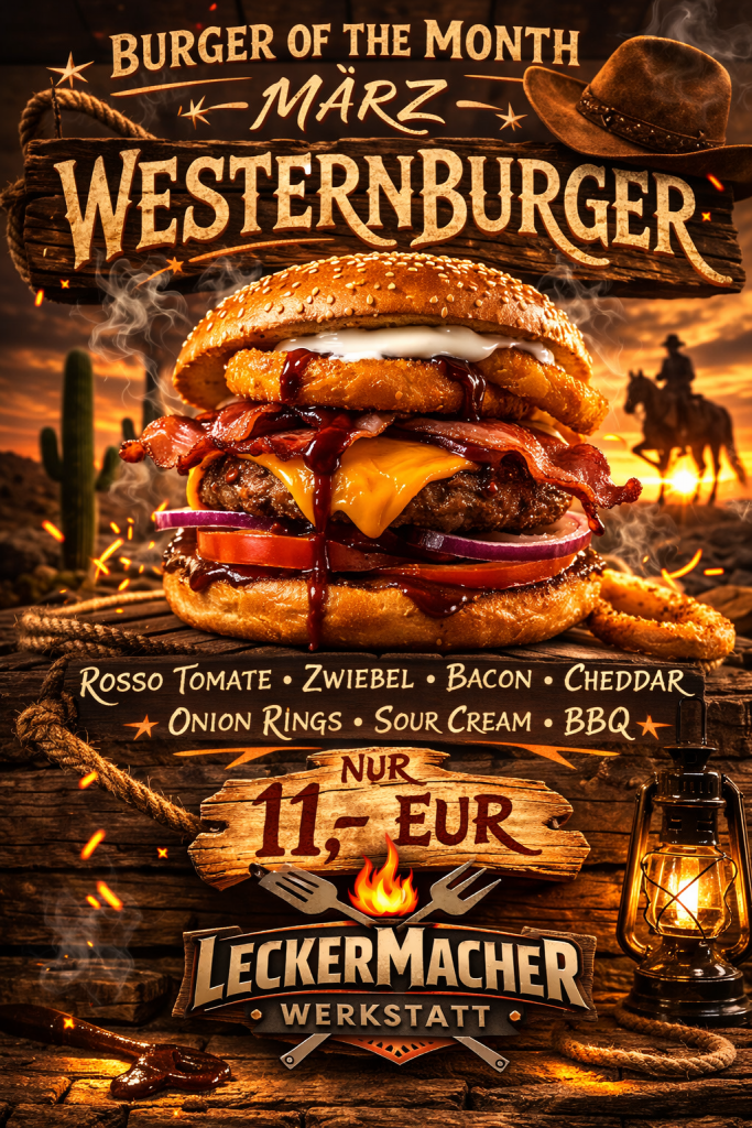 Liebe auf den ersten Biss – dafür sorgt unsere LeckerMacher-Crew. LeckerMacher-Werkstatt is(s)t für uns ein ganz besonderes Lebensgefühl, mit viel Liebe zu guten Burgern und tollem Service. Wir arbeiten immer mit viel Leidenschaft und einer mächtig großen Portion Spaß für deinen perfekten Burger-Genuss – und das kannst du schmecken.